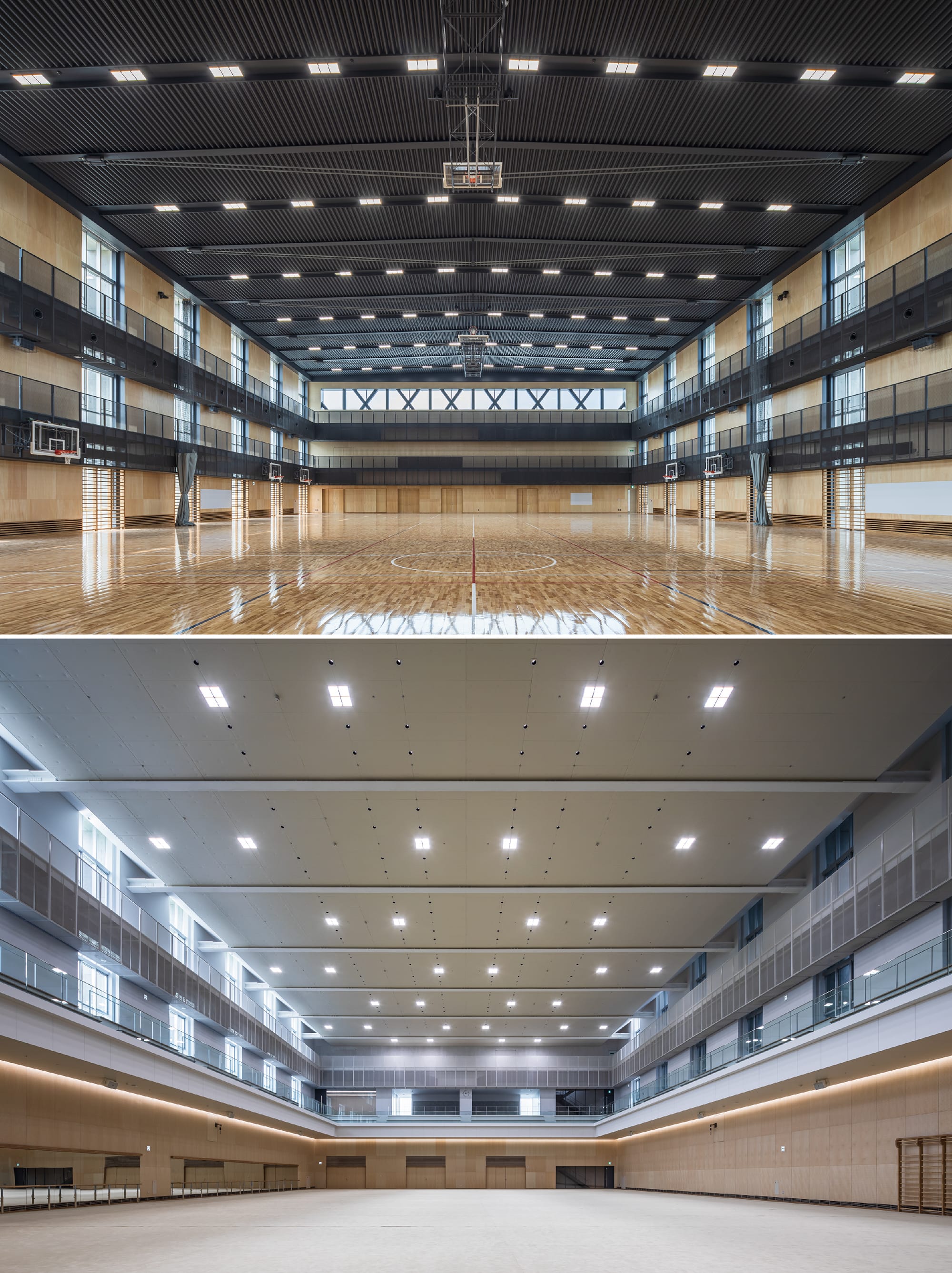 This gymnasium for Tokyo Women’s College of Physical Education was planned for the 120th anniversary. In order to layer large spaces on a campus surrounded by residential areas, we created an optimal practice space while considering the surrounding environment. The east and west facades, which create a sense of openness while controlling sunlight and views, are integrated with the equipment and structure for the large multilayered space. Various devices to induce exercise were placed in various locations to turn every area into a practice space.