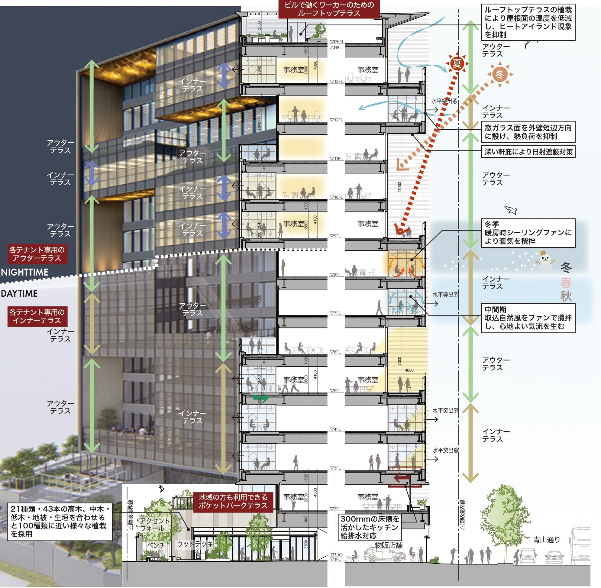 所謂テナントオフィスビルは何処にでも存在するが故に、都市における景観や空地形成を良質にする責務を担う。当計画では象徴的なテラスを持つテナントオフィスビルと地域に開かれたポケットパークを創出した。住宅と都市が隣り合う南青山の表通り(都市スケール・商業地域)と小路(ヒューマンスケール・住居地域)により生まれる都市の二面性こそが本敷地が持つ魅力と捉え、これを引き出す建築・ランドスケープデザインを目指した。