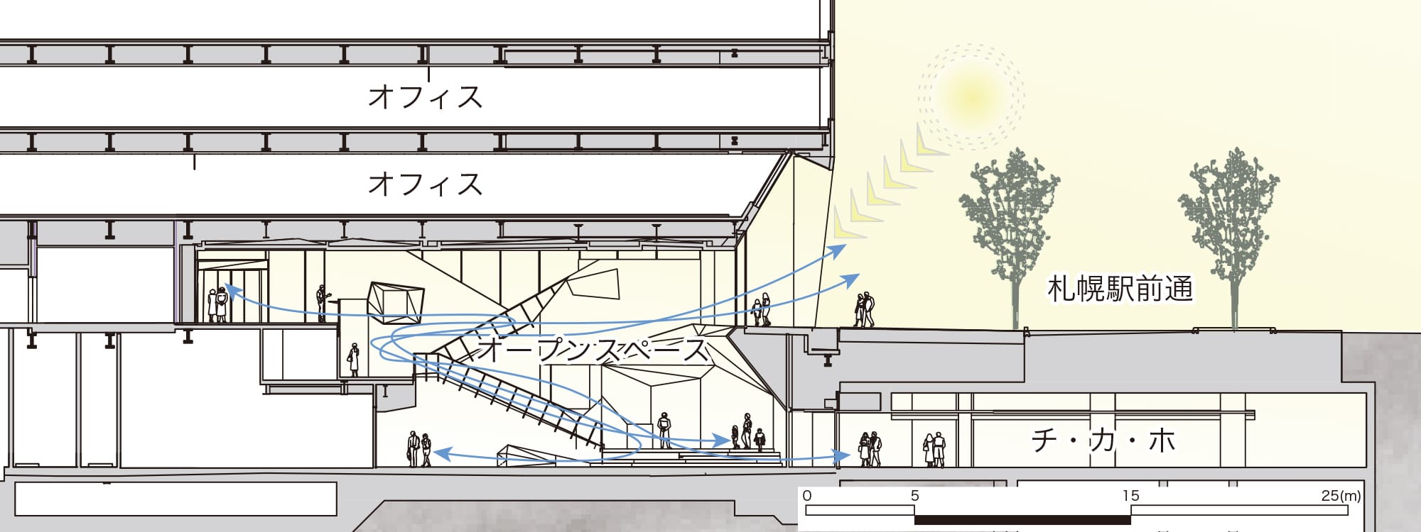 地上の札幌駅前通と、札幌駅と大通公園を結ぶ地下の大動脈「チ・カ・ホ」に直結するオフィスビル。地上と地下の分断をまちの課題と捉え、交差点に面し吹抜けを挿入、自然光を地下へと導き、階段とスキップフロア状の滞留空間を連続させたオープンスペースとすることで視線と動線を結び、地上と地下の賑わいをゆるやかに繋ぐ、地域に開かれた新しい広場空間の創出を目指した。