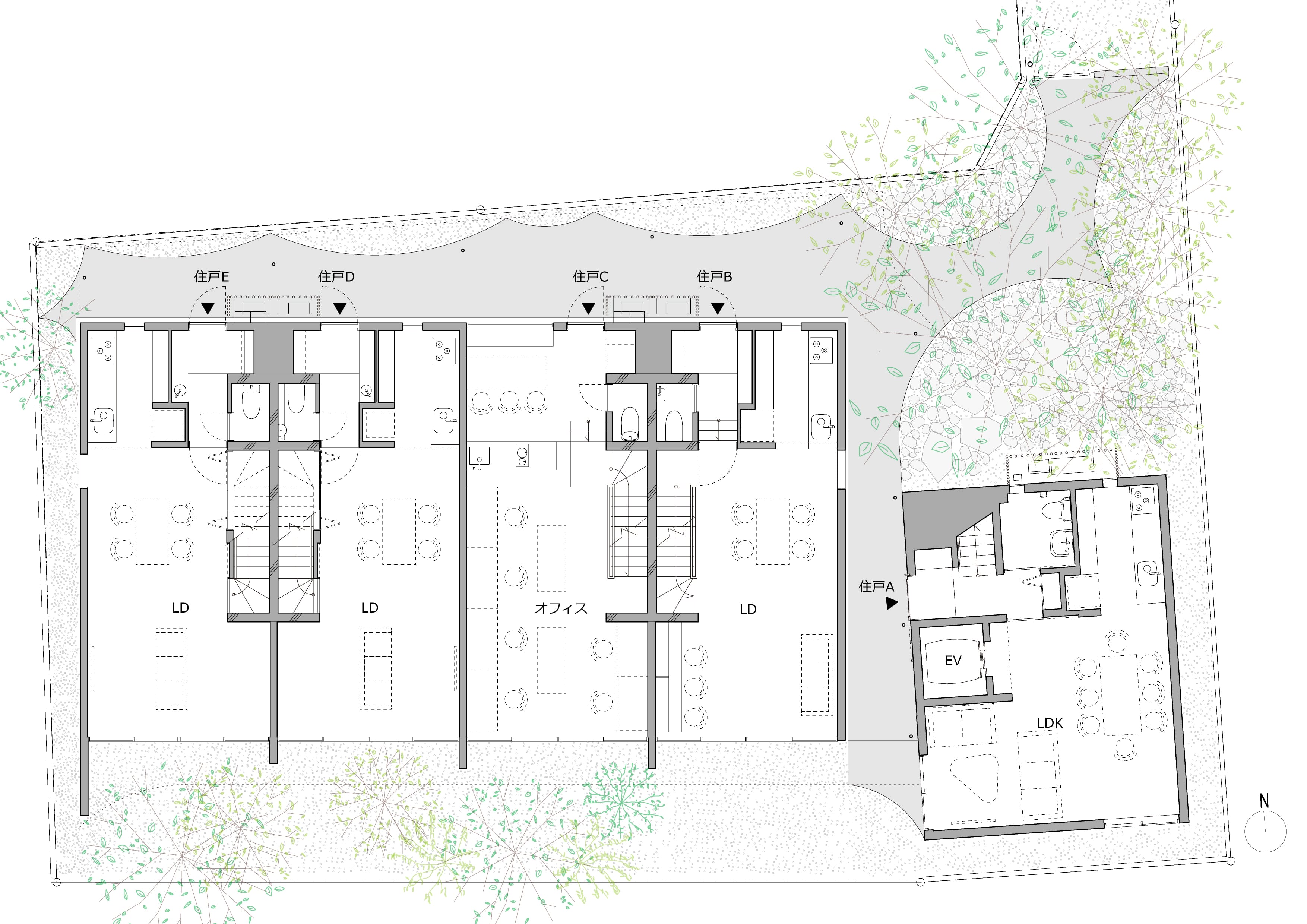 In order to ensure the peaceful inheritance of a plot of land in Tokyo, four siblings built a five-unit row house. In order to ensure equality and independence, the siblings’ units were arranged in a strip shape running north to south, and the parents’ unit was placed in a separate building. The eaves that extend far to the north and south, connecting the five units, create a space under the eaves, encouraging residents to interact. The younger generation was able to obtain a high-quality living environment that inherited the memory of the land.