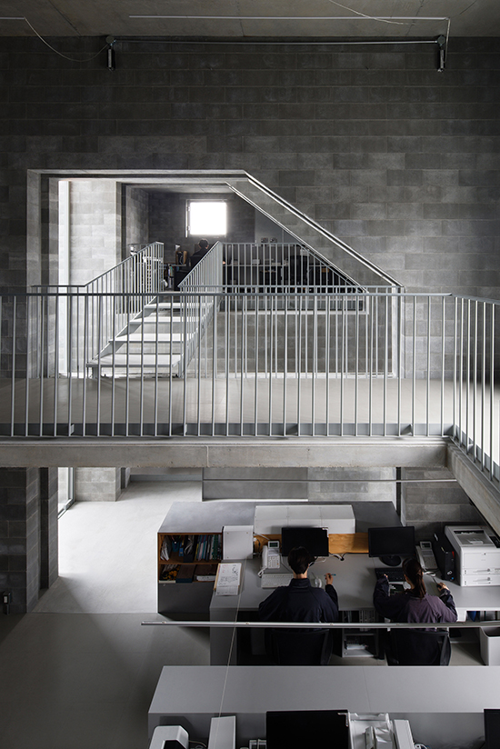 This project is the headquarters building of a concrete block manufacturer. With the aim of expanding the possibilities of block construction, the designer and the manufacturer began with research and development to improve the block’s strength, workability, and aesthetics. The structure “reinforced concrete masonry” (RM) construction was adopted to express pure block massing. We aimed to create an icon of block architecture by freeing the building from the structural constraints of RM construction, seamlessly connecting the interior and exterior, and creating a striking visual effect through the framework.