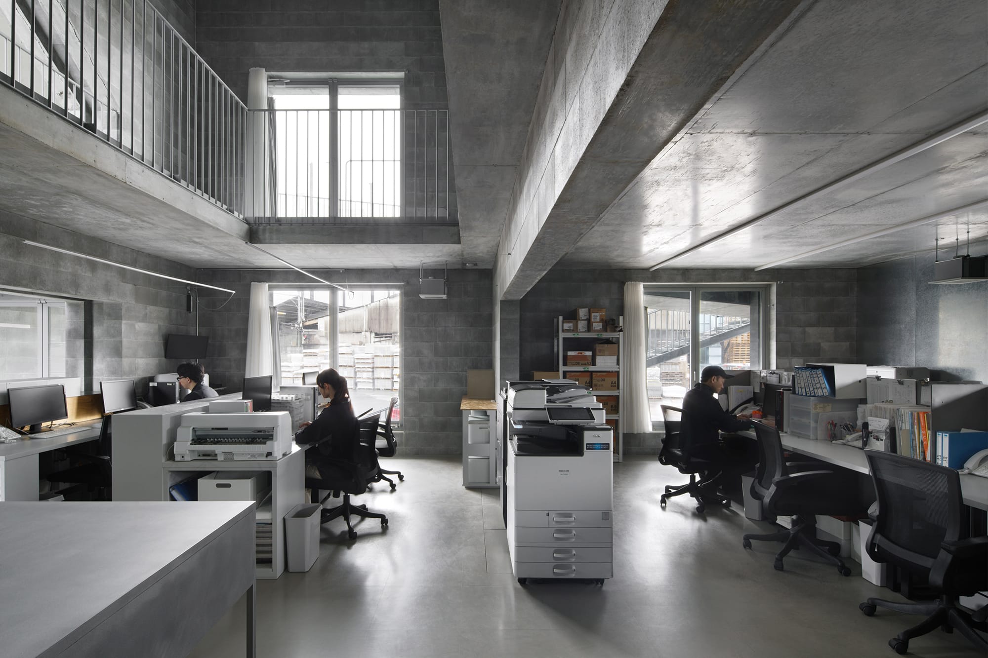 1階執務空間の壁に大開口を設けること、階高を最小限におさえることで上下・水平方向の距離を縮め、社員同士の連携を可能にする。
