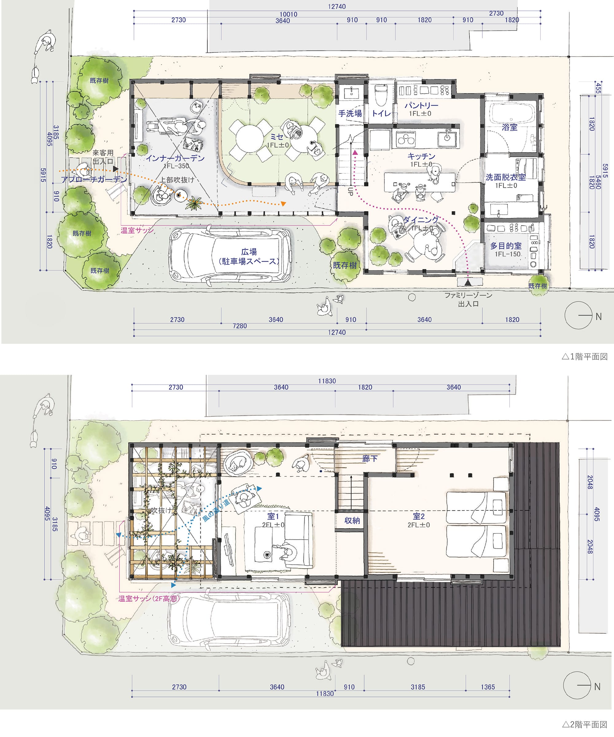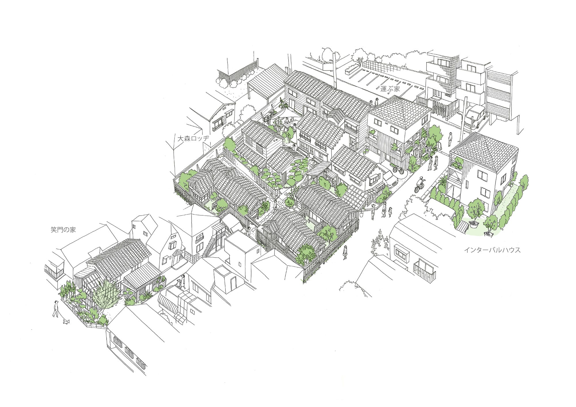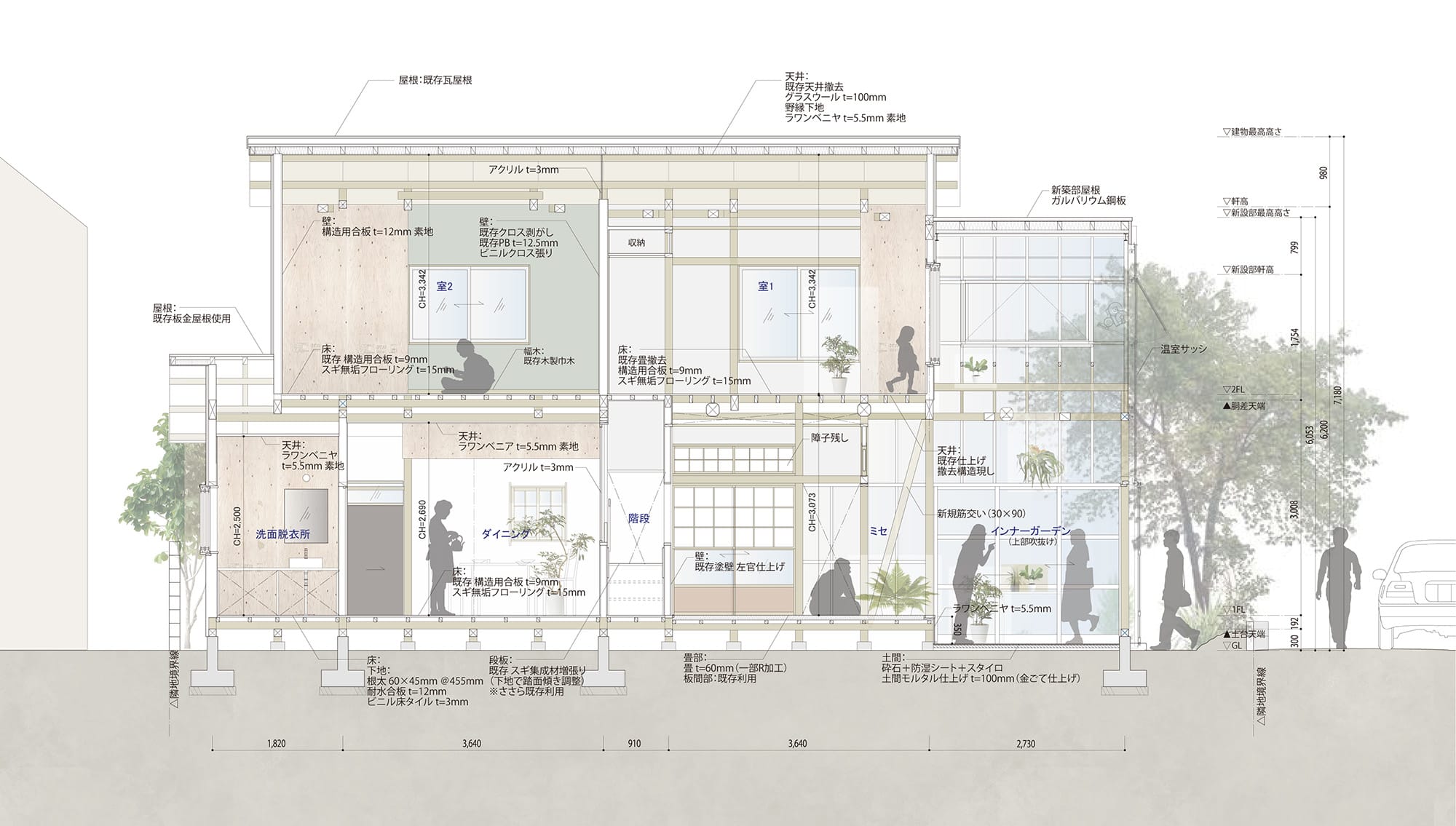 前作の「大森ロッヂ 運ぶ家」や「インターバルハウス」に続く一連のプロジェクトである。街角にインナーガーデンを設け、住まい手の営みがそのまま街角を形成。既存の下屋及びバルコニーを含めた空間を解体、風景を作っていた根拠(構造)は残しつつ、温室フレームで包み込むことで街と住まいの間の緩衝帯(庭)を設け、温熱環境、パブリックの入り具合、自己と他者がシェアする深度をも自ら調整をする住宅である。