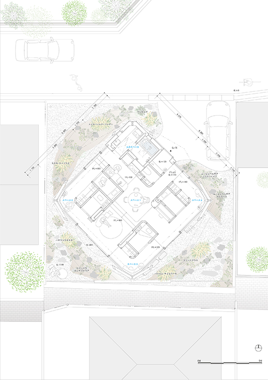 This is a house for a family of four in a suburban residential area developed in a hilly area. Considering that the lot below the southwest side of the site is vacant, the entire volume is configured at a 45-degree angle to the site to create an expansive environment. An octagonal spider- web-shaped structure is covered extending down from the top section to the supporting legs to create a centripetal single-room space. Inside four boxes, are arranged to create a corridor-like area that functions as the family room and living space.